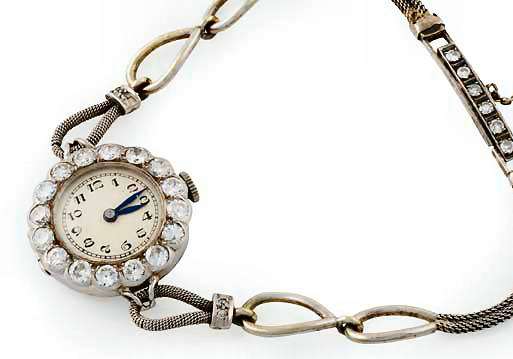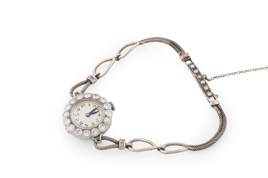 the champagne coloured circular dial with black Arabic numerals, the bezel set with sixteen round brilliant cut diamonds, fitted to a two-row woven and shaped oval link bracelet, with diamond set spacers and fold-over clasp set with a border of six single cut diamonds
