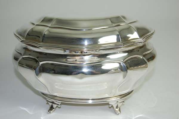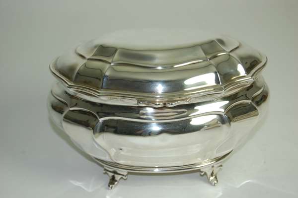 Hamilton & Inches, Edinburgh 1920, of baluster panelled form with domed hinged lid and raised on four bracket feet