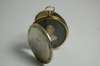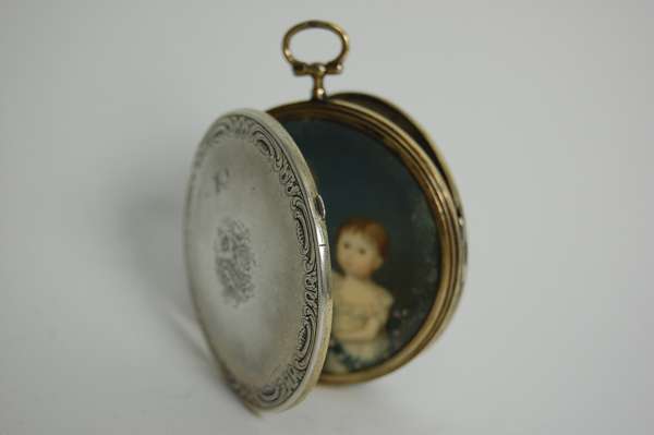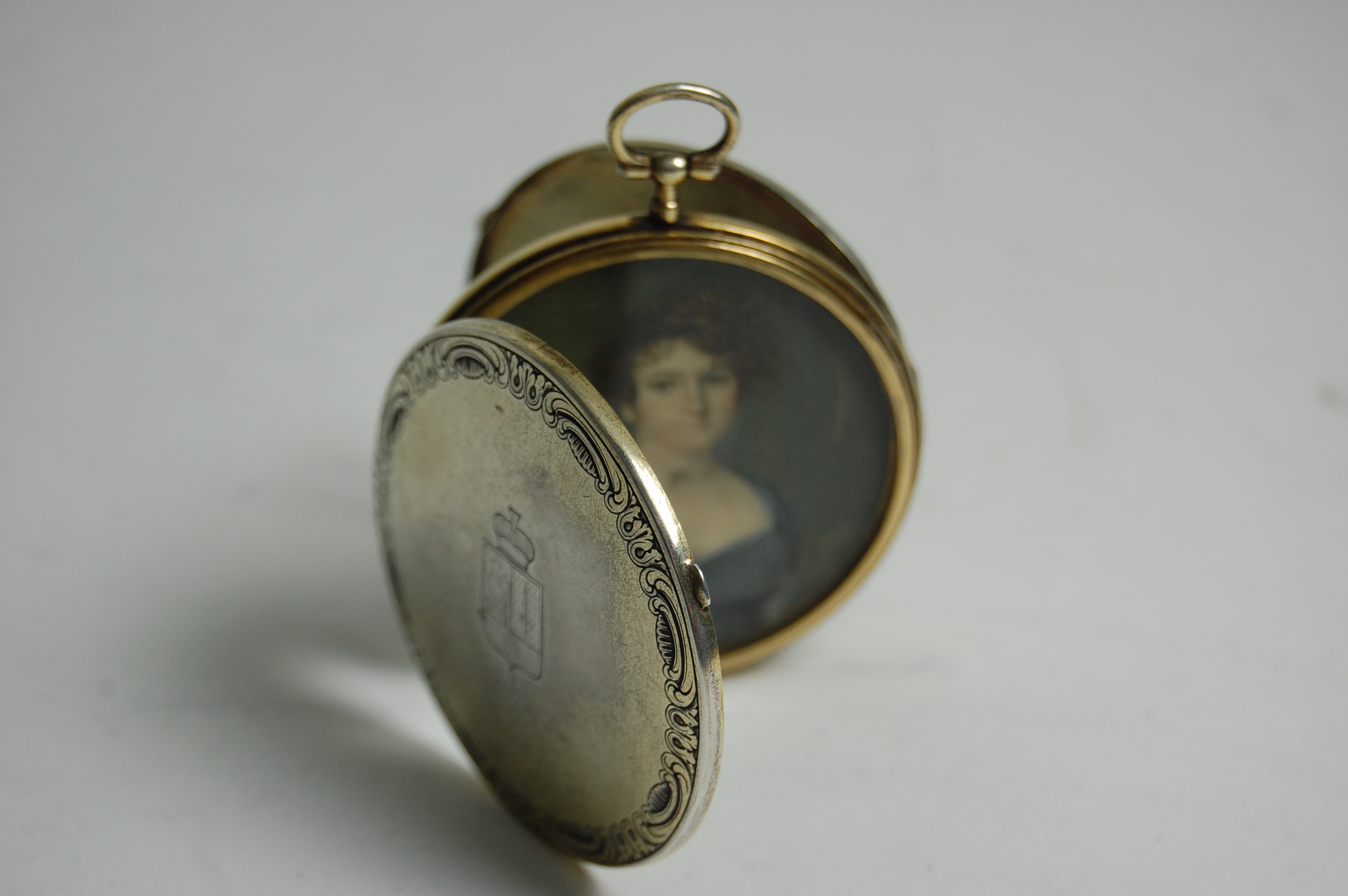 of circular form, plain loop suspension, 'C' scroll border, one side with armorial, the other with a bunch of flowers, the two covers opening to reveal a miniature of a lady and another miniature of two children