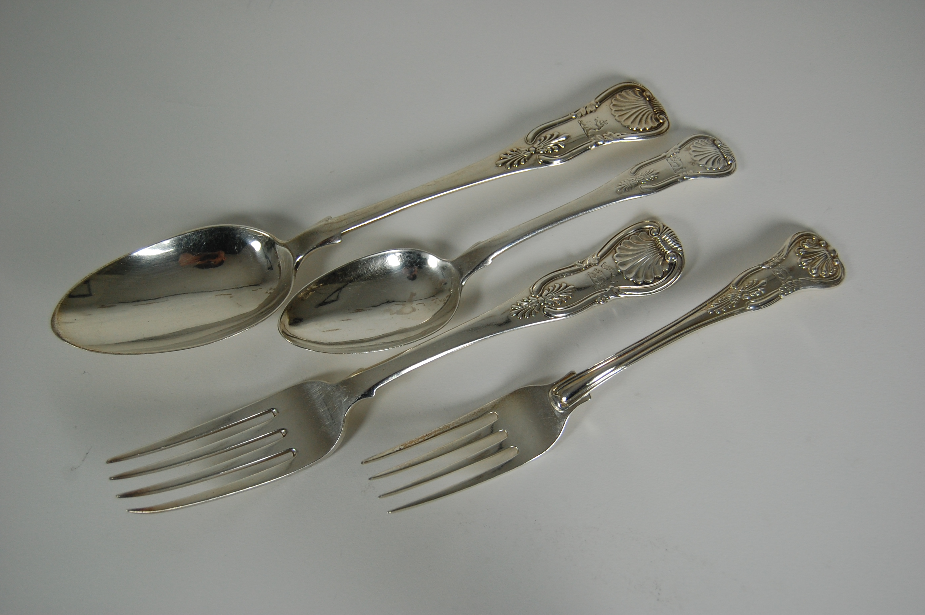 Scottish and first half of the 19th century, single struck, comprising; a pair of serving spoons; another, double struck; two cream ladles; sixteen table spoons; sixteen table forks; fifteen dessert forks; sixteen dessert spoons sixteen teaspoons