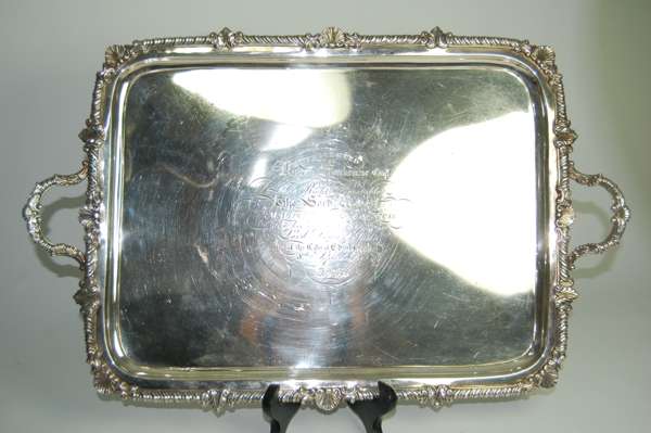 Fraser Howden Edinburgh 1813, rectangular form, shell and gadroon border, similar handles, engraved inscription; "Presented to Kincaid Mackenzie Esq. By the Right Honourable The Lord Provost Magistrates & Council for his eminent services as Lord Dean of Guild Of the City of Edinburgh 8th November 1833" all raised on shell bracket