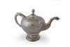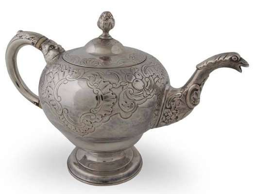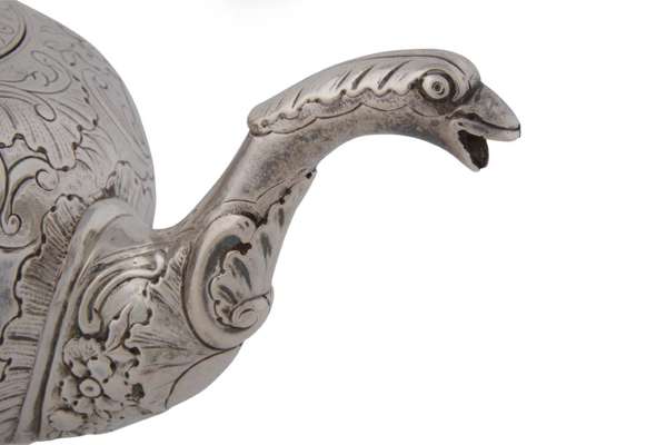 James Glen, Glasgow circa 1743, four marks; IG twice, S, Town crest oval punch, the teapot of inverted pear shape, the hinged cover with stylised shell and 'C' scroll border, mask detail to the leaf clapsed handle, the body with vacant cartouches and further scrolling foliate decoration, the curved spout with floral and scroll clasping and bird's head for the spout, all raised on a circular stepped foot