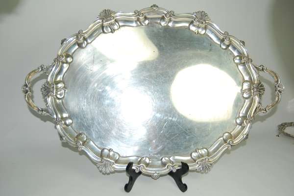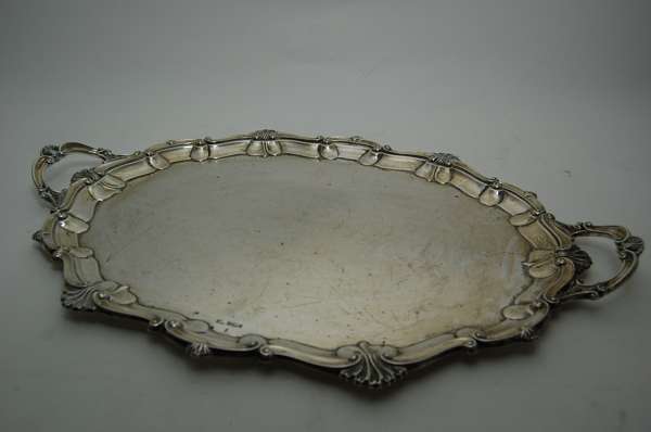 Sheffield 1901, of shaped oval outline with scroll and shell border, with two integral scroll formed handles with shell detail