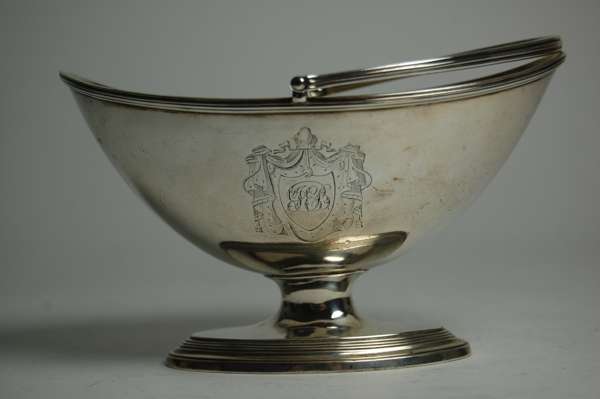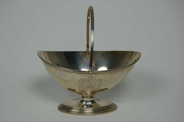 London 1809 (maker's mark indistinct), of simple navette outline with plain body with reeded rim, on waisted stem and spreading oval foot with reeded border, swing handle with simple reeded decoration