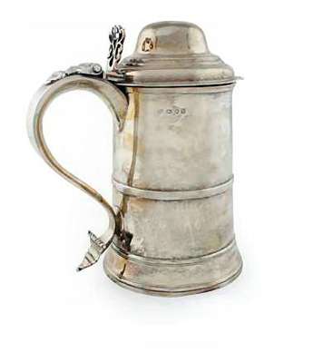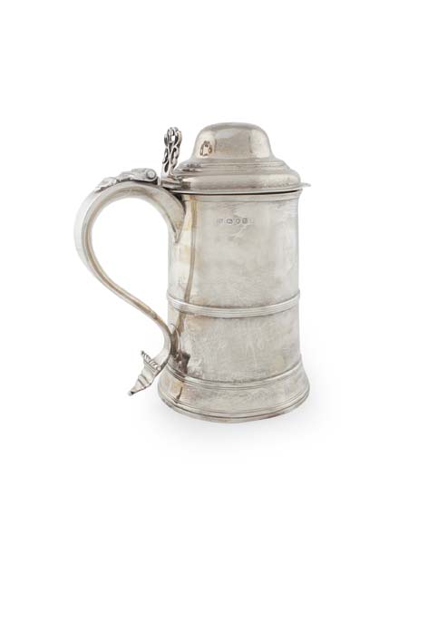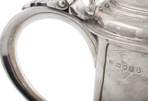 London 1806 makers mark indistinct (TG or TC), the simple body with moulded girdle, on flared foot and with stepped hinged coned cover, the 'S' scroll handle with openwork thumbpiece and with shaped scroll terminal