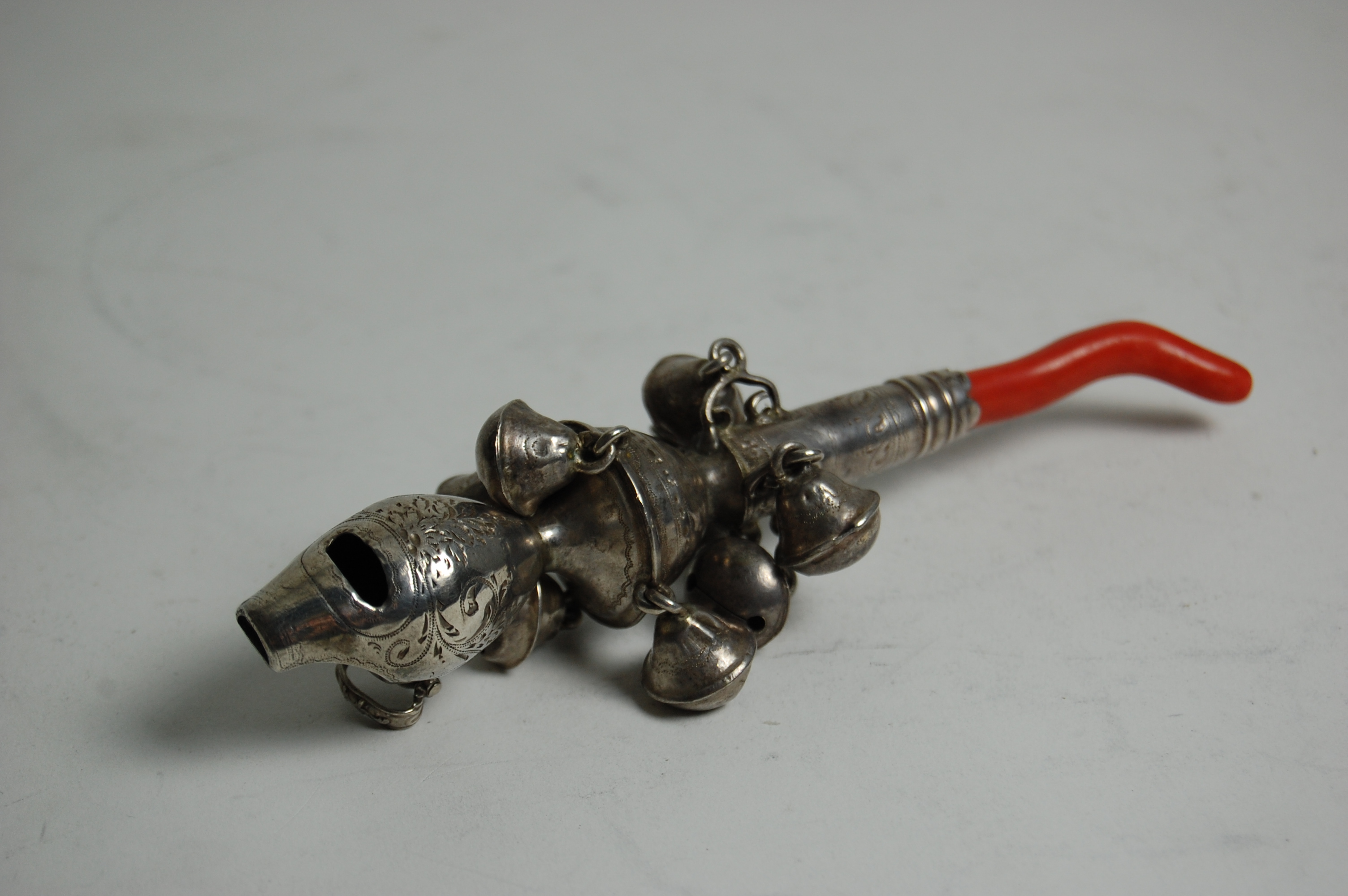 Peter & Ann Bateman, London 1799, the body with whistle terminal and baluster central section with four bells, the lower stem section also with four bells suspended from scroll mounts with scalloped terminal with coral teether