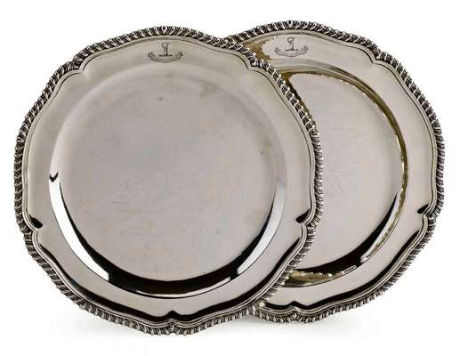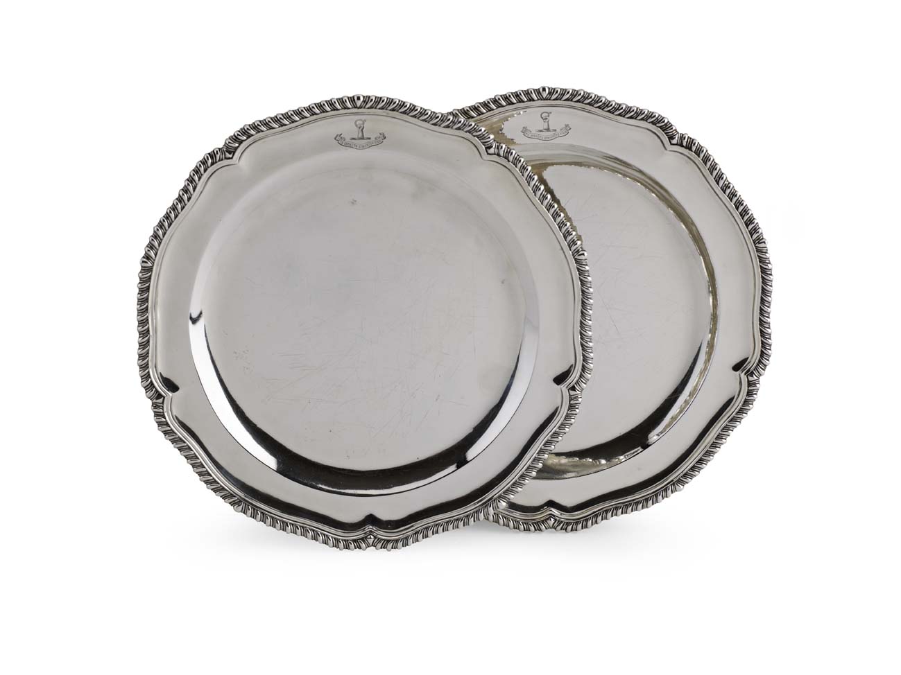 J Wakelin & W Taylor, London 1785, of conventional shaped outline with gadrooned border, with later crest engraved to rim (2)