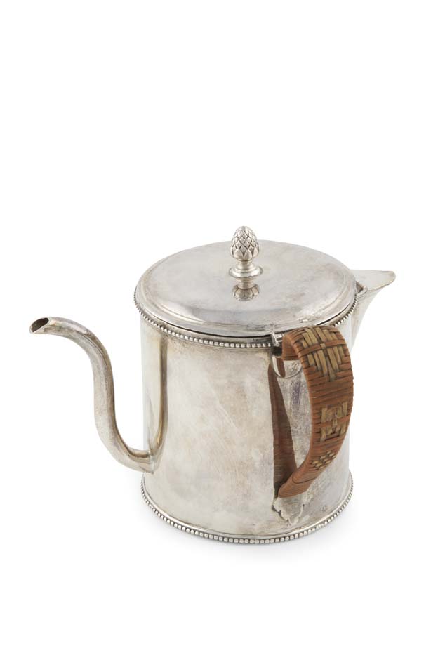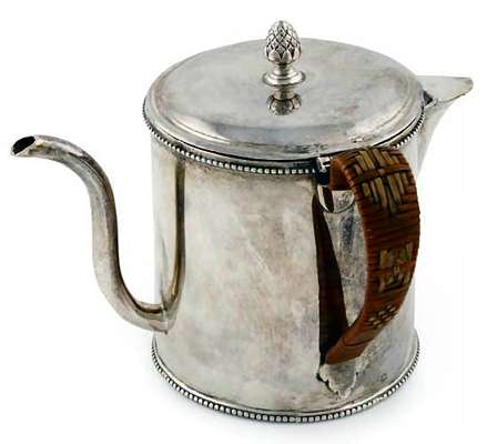 Andrew Fogelberg and Stephen Gilbert, London 1780, of cylindrical form, slender curved spout, beaded borders, basket weave covered handle, leaf clasped finial, lidded side spout