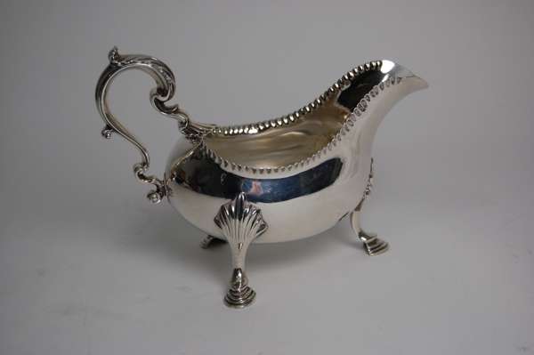 London 1773 (maker's mark indistinct), the deep bellied bowl with wide spot and everted beaded rim, with well cast 'S' scroll handle with acanthus leaf cap, raised on three scroll supports with hoof and shell terminals