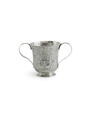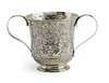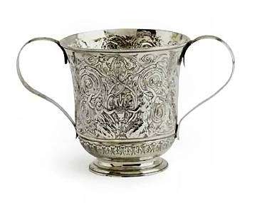 W and J Priest, London 1767, the cylindrical body with well chased body of classical figures in a setting with floral and scrolls, vase and cover, two reeded loop handles, acanthus leaf clasped border and on a circular spreading foot