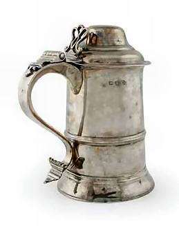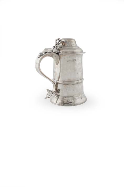 J Sutton & J Bult London1759, the slightly flared body with reeded girdle to lower section, on raised flater foot, the hinged stepped domed cover with open form thumbpiece on scrolling handle and shaped terminal
