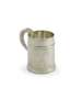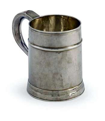 London circa 1700, of tapering form, slight moulded band, later engraved conjoined initials, scroll handle, marks rubbed