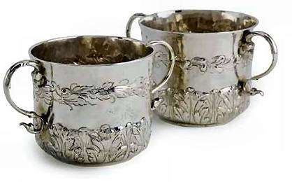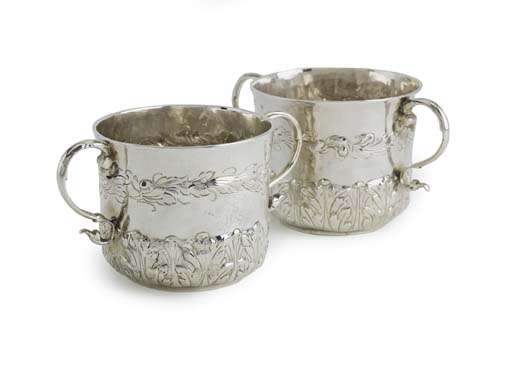 possibly John Ruslen London 1691, of circular form, simple scroll handles, foliate band above bands of palms and acanthus, pricked initials to each within pricked cartouche, both with crude initials to the underside and scratch weight on one, 11oz + 3dt