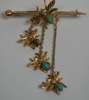 designed as a knife bar, applied to the centre with a fly set with seed pearls and a pear cut turquoise cabochon, fringed by fine belcher link chains each suspending a similarly set smaller fly