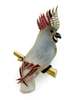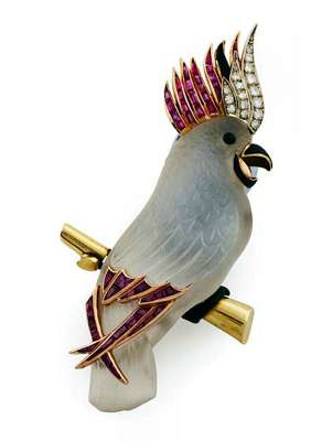 designed as a cockatiel, the naturalistically decorated rock crystal body applied with borders of round brilliant and single cut diamonds, calibre cut pink sapphires and onyx, two-coloured mounts stamped indistinctly to reverse