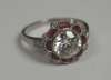 millegrain collet set to the centre with an early round brilliant cut diamond, within petal shaped borders, millegrain set with lunette cut rubies and old European cut diamonds, additionally set to each shoulder with two similarly cut diamonds