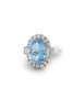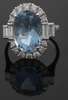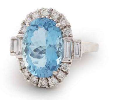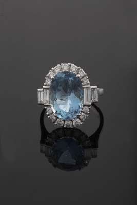 claw set with a large oval cut aquamarine, within a surround of round brilliant cut diamonds, additionally flanked to each shoulder by two graduated baguette cut diamonds, shank unmarked