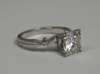 claw set with a round brilliant cut diamond, flanked by scroll shoulders, shank stamped 14K