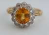 the central claw set oval cut golden yellow sapphire within a millegrained border of twelve round brilliant cut diamonds