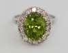 claw set with a fancy oval cut peridot, within a surround of round brilliant cut diamonds