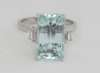 corner claw set with a large trap cut aquamarine, flanked to either shoulder by two graduated baguette cut diamonds