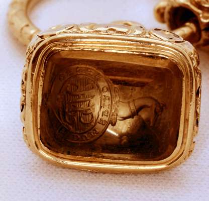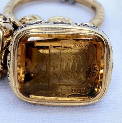 each intaglio engraved armorials and motto 'Dum Spiro Spero' crest of a greyhound head, well chased mounts and scroll supports