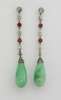 each composed of a millegrain collet set round brilliant cut diamond, surmounting a line, alternately set with marquise cut diamonds and circular cut rubies, suspending an ovoid cut jadeite jade cabochon drop, with post and butterfly fittings, stamped PT