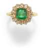 set to the centre with an octagonal cut emeralds, within a shaped circular surround claw set with old mine cut diamonds, with fluted gallery