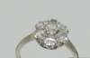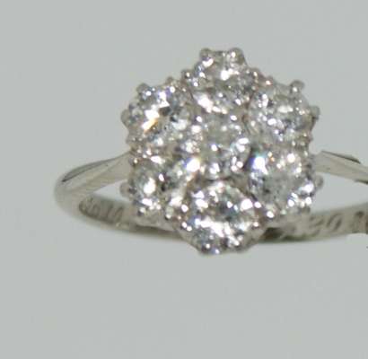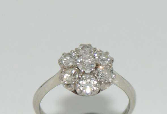 set as a central circular cut diamond and a surround of six circular cut diamonds, claw set in platinum