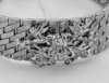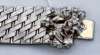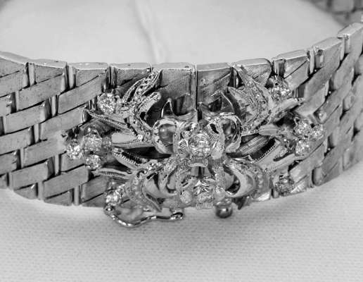 designed as a broad band, composed of satin-finished fancy flattened links, with concealed clasp applied with round brilliant cut diamond set foliate motifs, stamped 750