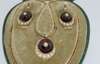 the pendant necklace and earrings with garnet cabochon and onset pearl and a graduated pearl set crescent below, the box marked for West & Son, College Green, Dublin