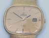 the gold coloured rounded rectangular dial with baton numerals and date aperture, itted to a broad tapering bracelet, with textured satin finish and fold-over clasp