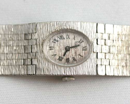 the oval small dial inscribed, bark effect white gold bracelet