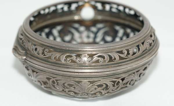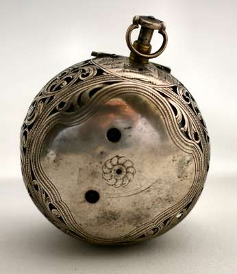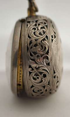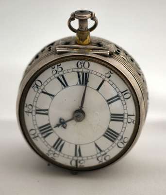 the outer cased with pierced and engraved C-scroll decoration, pierced sides, the circular white enamel dial with Roman and Arabic numerals, blued hands, the verge movement with slide lever, engraved detail to the brass frame, well pierced detail to the rear, key wind, the supports of circular and square baluster section, the movement inscribed Jon Mylbourne London and numbered 175