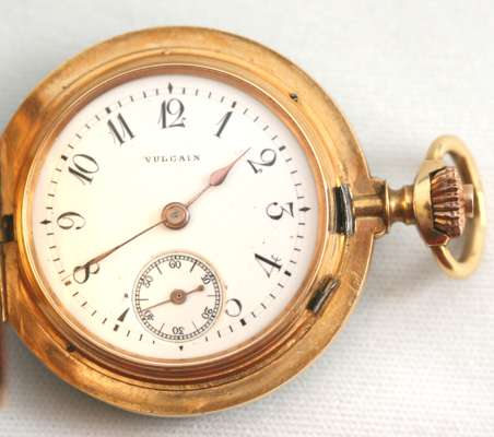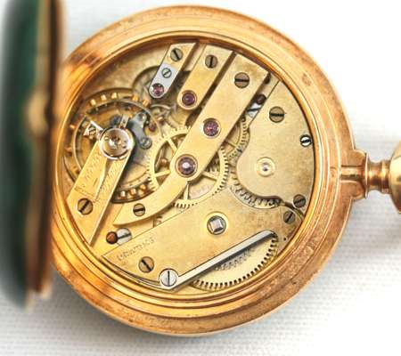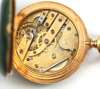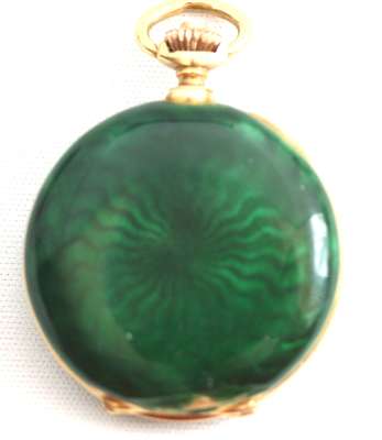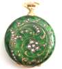 keyless wind and the hunting case with green guilloche enamel and set small rose cut diamonds in a scrolling floral design, the lever movement unsigned, white enamel dial with susidiary seconds dial and inscribed Vulcain