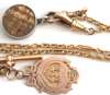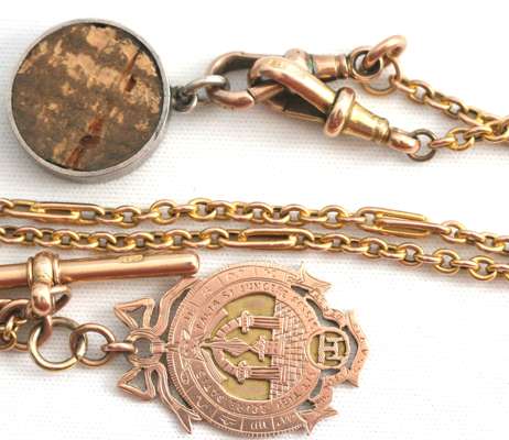 in full hunting case, plain, keyless wind and with a 9ct gold fetterlink Albert and a medal fob