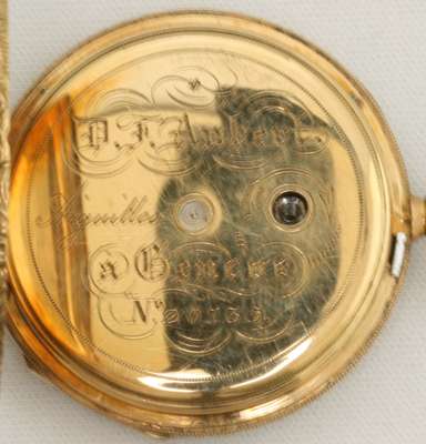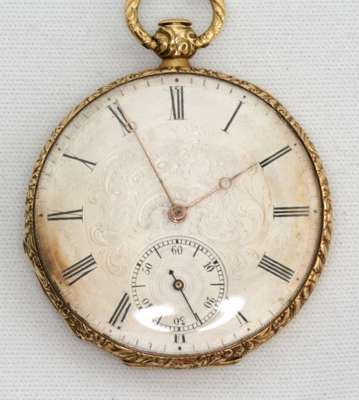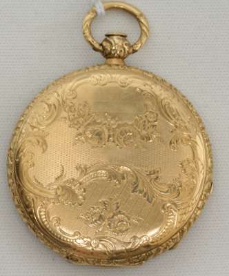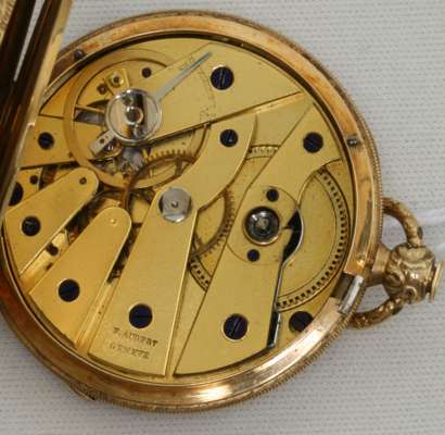 open faced with well engraved back cover, slimline case, silvered dial, key wind and the movement inscribed 'F Aubert Geneve'