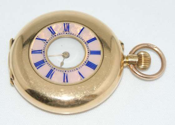 in a demi-hunting case pink enamel border with blue Roman numerals to the plain outer case, plain enamel dial, keyless wind lever movement