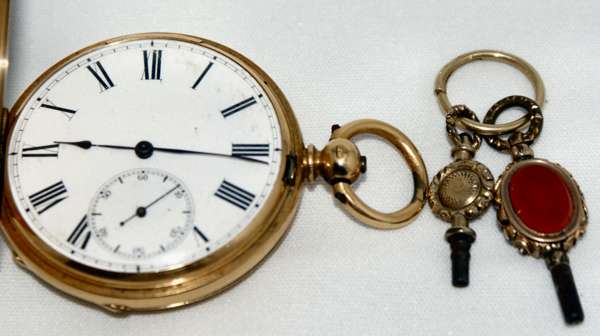 key wind, in plain full hunting cases, plain enamel dial, subsidiary seconds dial, plain lever movement, together with two Victorian gold mounted watch keys