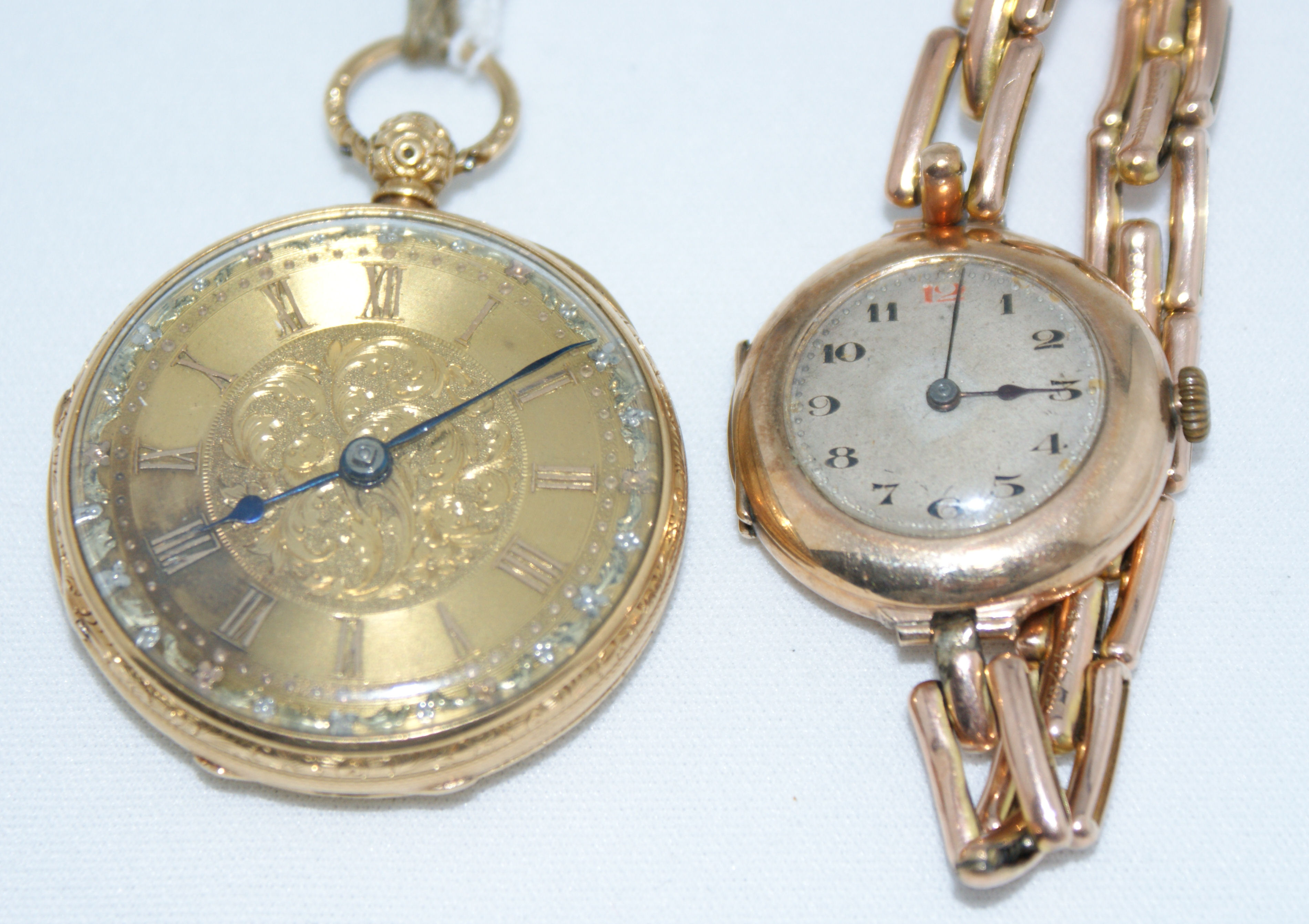 key wind, open faced and engraved case, gilt dial, and an Edwardian gold cased wrist watch on flexible bracelet