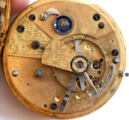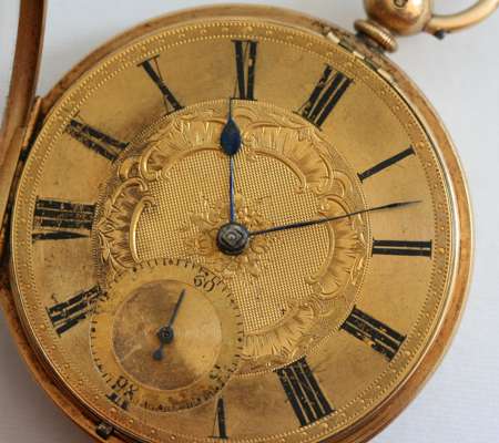 key wind,open faced with gold dial, subsidiary seconds dial, the outer case engraved and chased decoration, plain lever movement