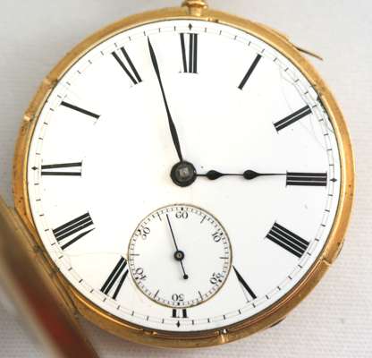 the outer covers with traces of engine turned decoration, blue enamel inner border of Roman numerals, white dial with subsidiary seconds dial, slide to side, open movement, inner cuvette with traces of engraving 'Viner & Co'.