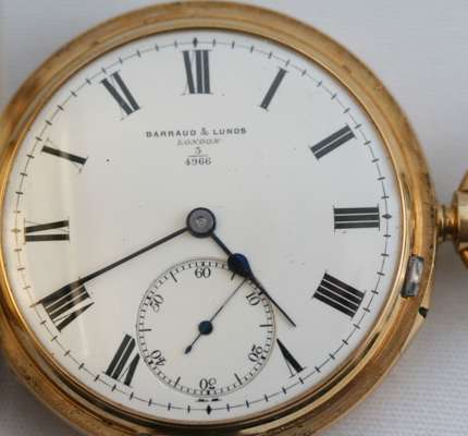 keyless wind, demi hunter cases, engraved inscription to the inner cover, the enamel dial inscribed Barraud and Lund, London, subsidiary seconds dial, the movement also inscribed