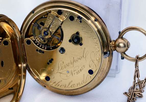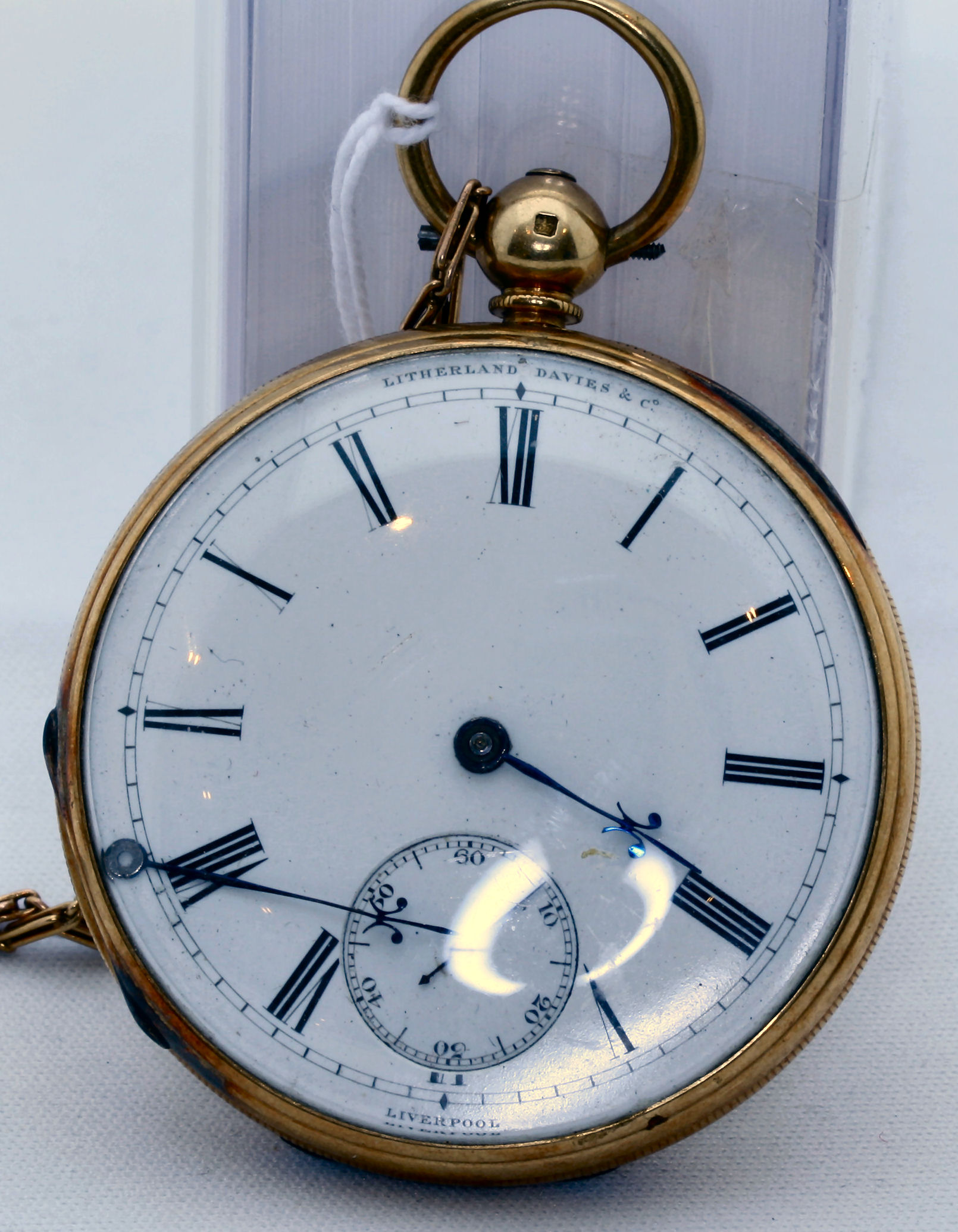key wind, open faced, engine turned case, white enamel dial, subsidiary seconds dial, the lever movement inscribed 'Litherland Davis, Liverpool, and numbered 21452' and a length of fine link gold chain