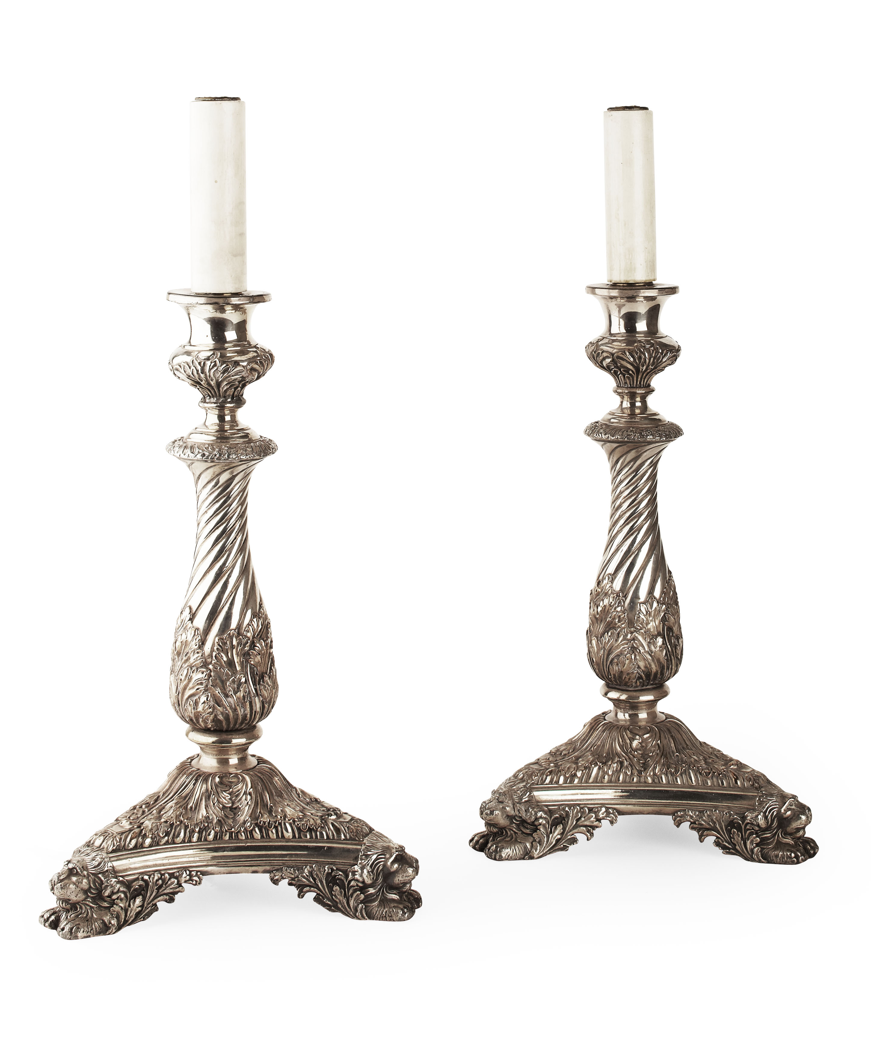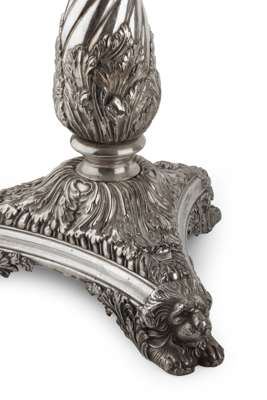 the slender knopped baluster columns with wrythen and foliate clasped design, raised on spreading domed tri-form base with acanthus decoration and raised on gadrooned bracket feet with lion mask terminals