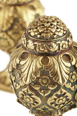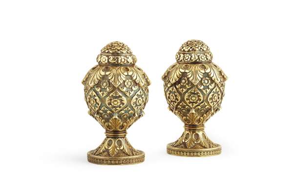 marked to underside of base STERLING SILVER, the slender baluster bodies with heavily embossed acanthus leaf decoration to base and shoulders, with flower head designs within cartouches to middle section, with domed covers with all-over flower head motifs and pierced decoration, raised on a spreading acanthus detailed foot rim (2)