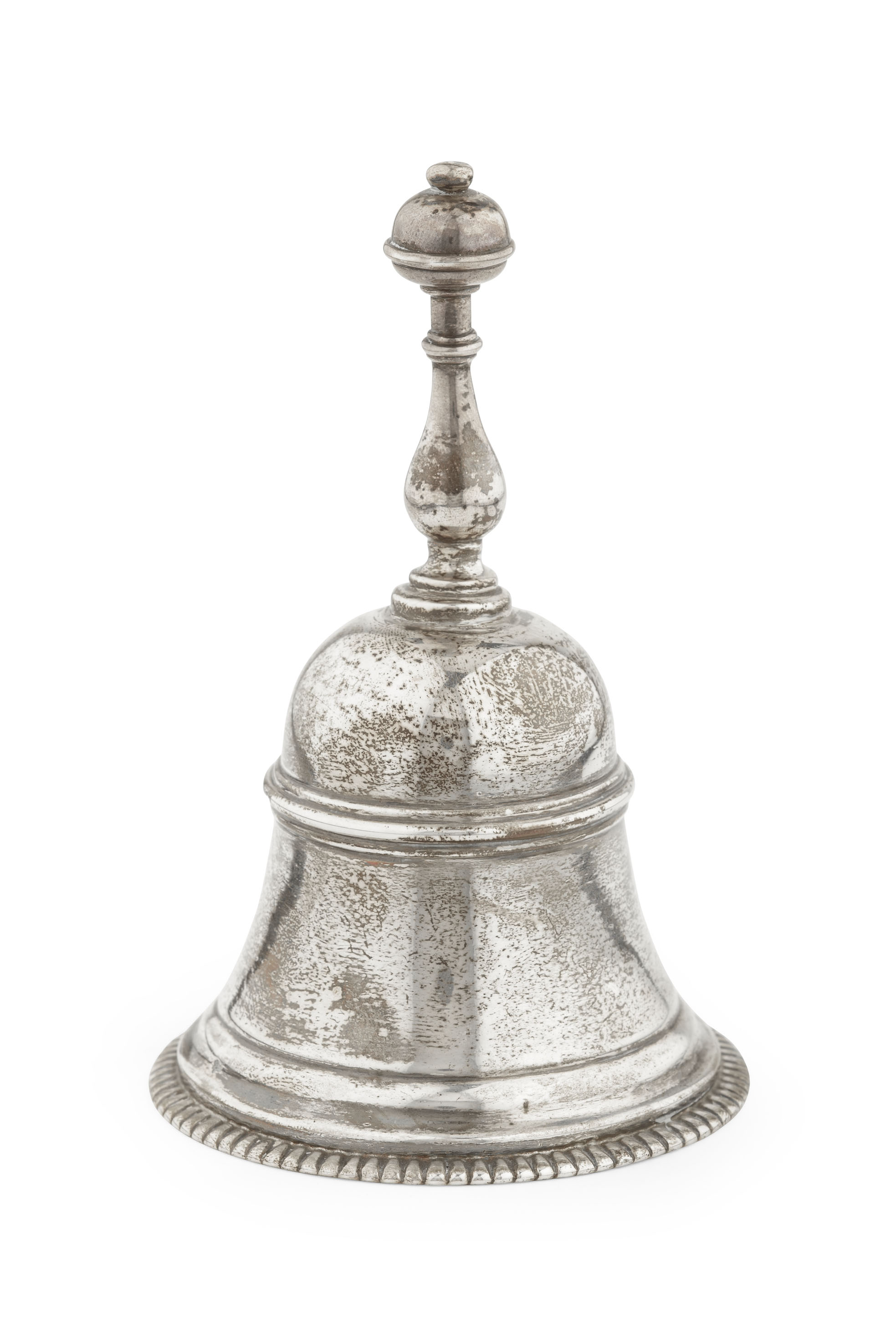 indistinctly marked to lower section of inside, the domed bell with reeded girdle and gadrooned rim, with baluster handle