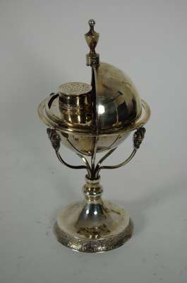 possibly Danish, the spherical central stand with twin dropping covers revealing mounted glass inkwell and sanders, the whole supported within sweeping strut frame with mask terminals with urn finial, raised on a knopped stem with spreading foot and chased running foliate and flower head foot