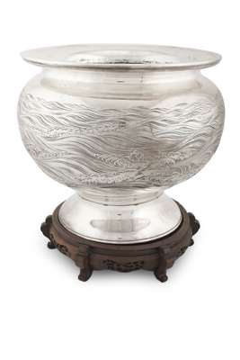 with character and seal marks to base, the large tapered baluster body with chased running decoration of turbulent seas, on waisted stem and simple circular foot, with lift out pierced flower holder cover and raised on a pierced hardwood stand