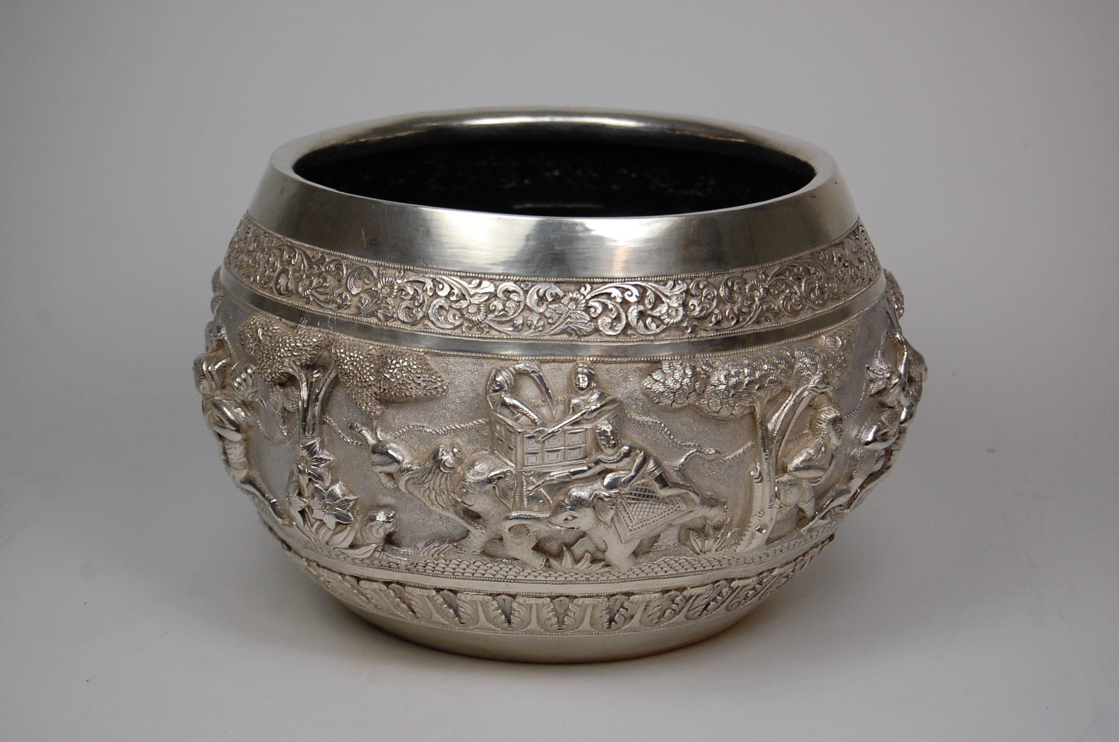 unmarked, the tapered bowl with chased scrolling rims and wide high relief embossed panels of a hunting party, the base with chased elephant